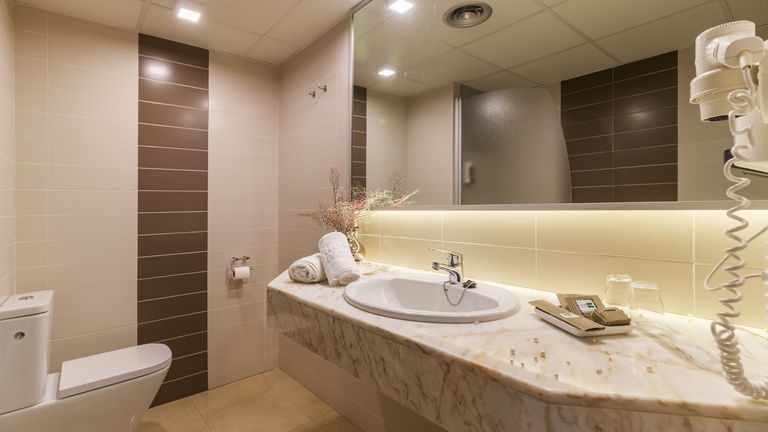 Aire acondicionado/calefacción. Camas de 90cmx190cm (cama de matrimonio bajo petición). TV 32'' con TDT y via satélite. Conexión wifi gratuita. Mini-nevera gratuita. Teléfono. Caja de seguridad (con suplemento). Baño completo con secador y set de amenities. Terraza exterior con vistas a la avenida.