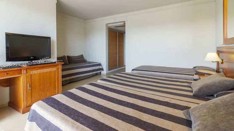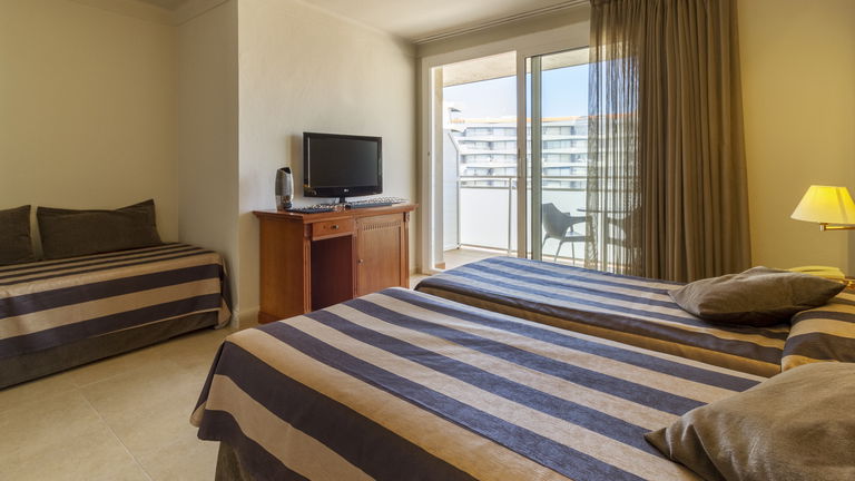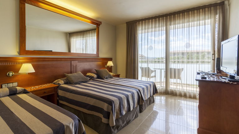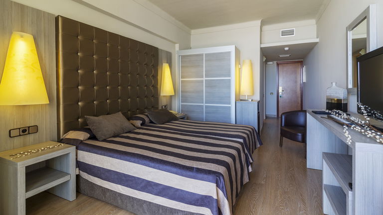Aire acondicionado/calefacción. Camas de 90cmx190cm (cama de matrimonio bajo petición). TV 32'' con TDT y via satélite. Conexión wifi gratuita. Mini-nevera gratuita. Teléfono. Caja de seguridad (con suplemento). Baño completo con secador y set de amenities. Terraza exterior con mesa y sillas y vista a la piscina.